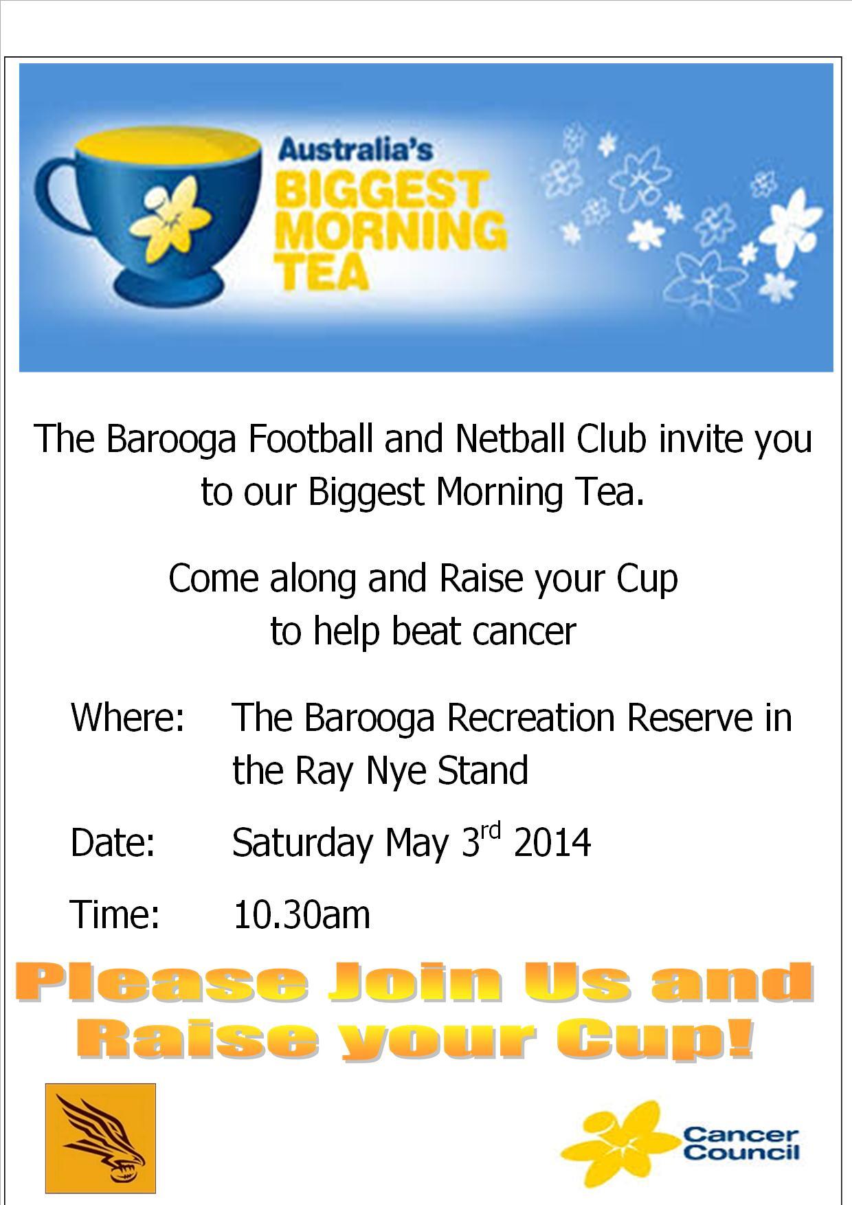 3 from For more information on any of our fundraising activities, please call us on 1300 65 65 85 or email events@cancerwa.asn.au. On 26 may 2005, the event broke the guinness book of records record for the world's largest stimulation tea party with around 1 million australians participating and supporting cancer council on the day. Bowel cancer is one of the types of cancer targeted by australia's biggest morning tea, cancer council australia's flagship event. The australia's biggest morning tea was started by the cancer council 25. Twenty years ago, we launched cancer council's australia's biggest morning tea. William barrett and sons will host its 25th consecutive australia's biggest morning tea on bthursday to raise money for cancer research. Australia's biggest morning tea one of cancer council's major fundraisers is australia's biggest morning tea. Doors open 8.30am for 9.30am start.